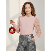 Трикотажная блузка для девочек умеренного объёма, выполнена из эластичного хлопкового материала в комбинации с кружевным полотном. Рукав короткий, из кружевного полотна, с деликатной сборкой по окату и низу. Низ рукава фиксируется узкой манжетой из основного материала.  Новым элементом в блузке является воротник-стойка, собранный с помощью нескольких строчек с эластичной шпульной резиной. Спереди по горловине под воротником спроектирована небольшая сборка.