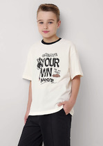 Футболка для мальчика свободного кроя - это идеальный выбор для активного ребенка. Вырез горловины обработан эластичной тканью — она прекрасно держит форму, не растягивается, при этом ребёнку удобно надевать и снимать футболку. Изделие неприхотливо в уходе. Футболка летняя с принтом и надписями в стиле Digital. Перевод надписей: "let's be creative" - будь креативный,  "think bold" - думай смелее, "enjoy" - наслаждайся, "have fun" - веселись.Яркая спортивная футболка подходит как для подростков так и для малышей в детский сад. Подходит для любого времени года.
