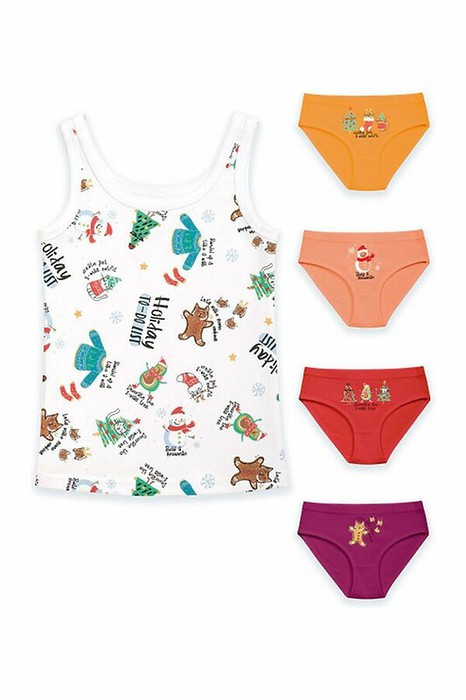 Детский комплект белья для девочки малыша из хлопка с новогодним принтом. В набор входит бельевая майка на широких лямках и трусы слипы 4 штуки. Подарите ребенку праздничное настроение и хорошее начало дня. Новогодняя коллекция, яркий цветной набор с принтом с надписями, идеально подойдет для подарка ребенку. Пошив высокого качества, аккуратные швы, которые не доставят дискомфорт для ребенка. Трусики и майка идеально впишутся в гардероб девочки как базовое детское нижнее белье. Удобная и практичная модель майки для детей подходит для повседневной носки дома, как одежда для сна, для занятия спортом, для занятия спортом, а еще в нем весело готовиться и встречать новый год. Трикотажные детские трусики слипы для подростка с эластичной резинкой по талии надежно держатся на теле, не скручиваются, не закатываются и не сползают, а дышащая ткань позволяет избежать натирания нежной кожи.