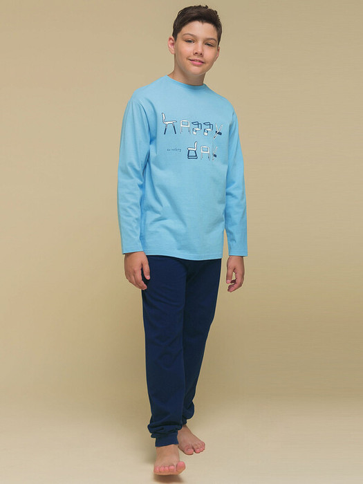 Плюс 100 к уюту с нашей стильной пижамой для мальчика! Модель в стиле "хюгге" выполнена из 100% хлопка — оптимальный состав для детской пижамы. Изделие мягкое, отлично пропускает воздух, позволяя коже ребёнка дышать. При этом в пижаме из хлопка ребёнку будет комфортно, даже если он сбросит одеяло во сне.  Джемпер и брюки среднего объёма, рукава свободные — в пижаме очень удобно спать. Широкая и мягкая резинка в поясе не перекручивается и не давит. Манжеты брюк и отделка горловины джемпера из эластичной рибаны — они не растягиваются, пижаму удобно надевать и снимать. Брюки выполнены в трендовом синем цвете и лаконичном дизайне. Джемпер голубого цвета декорирован уютным принтом с позитивным текстом. Перевод: "Счастлив. День безделья". Принт мягкий и эластичный, прекрасно переносит частые стирки. Такая пижама идеальна для игр, сна как дома, так и в детском саду — прекрасный подарок любому мальчику. Станет замечательным подарком, который способен вызвать искреннюю радость у вашего сына, внука, племянника, оставив