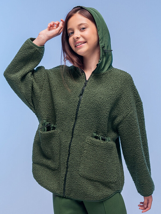 Флисовая куртка детская для девочки. Изделие выполнено в сочетании двух материалов: бербер-флиса с мягкой фактурой «барашка» и гладкой курточной ткани. Это один из наиболее актуальных трендов сезона. Капюшон и отделка вдоль застёжки из курточной ткани — максимум практичности. Ребёнок не промокнет, а ткань вдоль молнии не будет мараться при частом использовании. Толстовка детская модного оверсайз-силуэта со спущенным плечом подарит ребёнку комфорт и не будет стеснять его движений. Высокий воротник защищает шею от холода и ветра. По переду застёжка на центральную молнию с крупным пуллером — ребёнку просто застёгивать и расстёгивать. Тканевый стоппер защищает подбородок от зажима молнией. Низ изделия и низ рукавов окантованы эластичной тесьмой — они не растягиваются и сохраняют форму и отличный внешний вид надолго. Куртка с двойными накладными карманами: верхняя часть из основной ткани, внутренняя — из курточной — оригинально и стильно. Объём капюшона и объём внутренних карманов регулируется при помощи эластичной тесьмы со стопперами. Капюшон двухшовный, что обеспечивает анатомически правильную форму и комфортную посадку по голове. Оверсайз-куртка однотонная, без принта. За ней просто ухаживать. Оба материала состоят из полиэстера — толстовка тёплая, лёгкая, мягкая, просто стирается и быстро сохнет, не выгорает и не скатывается, сохраняет отличную форму надолго. Куртка выполнена в зелёном цвете (актуальный оттенок хаки). Размерный ряд: 1 (86); 2 (92); 3 (98); 4 (104); 5 (110); 6 (116); 7 (122); 8 (128); 9 (134); 10 (140); 11 (146). Мягкая куртка идеальна для девочек дошкольного и младшего школьного возраста, а также девочек-подростков. Подходит для детского сада, прогулок, активного отдыха, спорта. Худи с капюшоном можно носить круглогодично: прохладным летом, осенью и весной (демисезон), зимой. Оно может заменить ветровку в начале осени или конце весны, а зимой послужит тёплым средним слоем одежды. Стильный и практичный подарок дочери, внучке или сестре на Новый год и любой другой праздник.