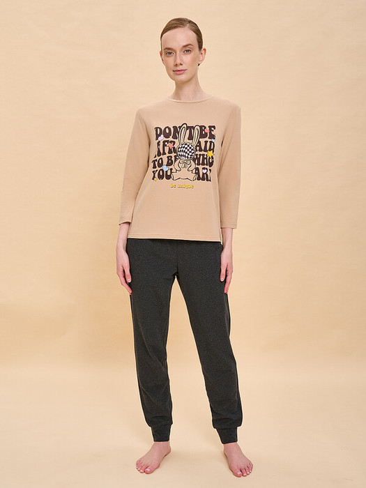Костюм пижамный женский. В составе ткани преобладает высококачественный хлопок — комплект для сна мягкий, гипоаллергенный и хорошо пропускает воздух. В хлопковой пижаме вам будет тепло и уютно во время сна. Благодаря эластану изделие надолго сохранит первоначальную форму. Джемпер и брюки умеренного объёма, плечо немного спущено, рукава широкие и свободные — в пижаме очень удобно спать. В поясе брюк мягкая и широкая резинка — не перекручивается и не давит. Отделка горловины из эластичной рибаны — она не растягивается, пижаму удобно надевать и снимать. Манжеты брючин широкие, из основной ткани — не передавливают ногу. Хлопковая пижама украшена милым, «няшным» принтом в виде забавного зайчика с позитивным настроением, надписи переводятся: «не бойся быть тем, кто ты есть», «ты уникален». Пижамный костюм неприхотлив в уходе. Принт мягкий и прочный, хорошо переносит частые стирки. Пижама женская с брюками подходит как для сна, так и просто для отдыха дома. Помните о правильном уходе за изделием: рекомендуется стирать при температуре не выше 30 °C, без предварительного замачивания, с изнанки. Это поможет сохранить качество и цвет пижамы на длительное время.