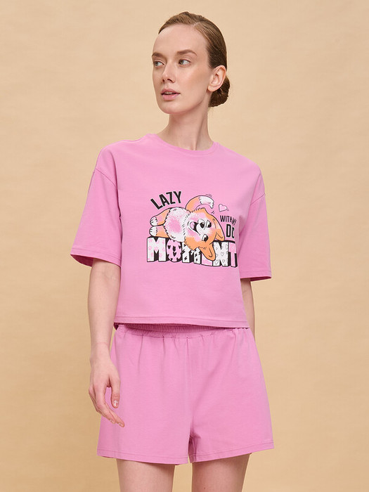Пижама женская с шортами. В составе ткани преобладает высококачественный хлопок — комплект для сна мягкий, гипоаллергенный и хорошо пропускает воздух. В хлопковой пижаме вам будет комфортно и уютно во время сна. Эластан помогает модели надолго сохранить первоначальную форму. Футболка укороченная (кроп-топ), свободная, плечо спущено, рукава широкие — в пижаме очень удобно спать. В поясе шорт мягкая и широкая резинка — не перекручивается и не давит. Отделка горловины из эластичной рибаны — она не растягивается, пижаму удобно надевать и снимать. Хлопковая пижама украшена милым, «няшным» принтомв виде собачки корги, надпись переводится: «ленивый момент с моей собакой». Пижамный костюм неприхотлив в уходе. Принт эластичный и мягкий, легко переносит частые стирки. Милая пижама подходит как для сна, так и просто для отдыха дома, пижамной вечеринки. Помните о правильном уходе за изделием: рекомендуется стирать при температуре не выше 30 °C, без предварительного замачивания, с изнанки. Это поможет сохранить качество и цвет пижамы на длительное время.