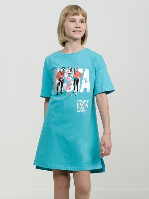 Платье расслабленного силуэта, со спущенным мягким плечом, рукав по типу рубашечного, книзу слегка расширенный. Перепад длины переда и спинки, с разрезами в боковых швах. Принт фэшн стилизация графика шрифты серебряным металликом. Перевод Инста сторис. Надпись белым Не знаю, все равно.