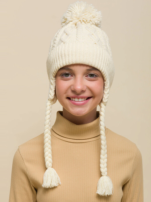 Стильная и уютная детская шапка с помпоном. Нейтральный дизайн делает её подходящей и мальчикам, и девочкам. Модель с отворотом и цельновывязаными функциональными ушками с завязками выполнена из 100% акрила. Материал тёплый, приятный на ощупь и очень комфортный. Шапку легко стирать — она не растягивается, не мнётся и сохраняет первозданный вид надолго. Отличные терморегулирующие свойства акрила позволяют носить изделие в холодную погоду. Внутри флисовая подкладка. Она мягкая и обеспечивает дополнительную защиту от холода. Модель хорошо садится по голове ребёнка, плотно прилегает, не сползает. Основная вязка шапки — модные текстурные “косы”. Цельновывязаные ушки по бокам прикрывают уши ребёнка от холода и ветра. Декоративные завязки выполнены в виде косичек с кисточками — оригинально и стильно. Помпон выполнен из ниток в тон изделия. Эта модель станет отличным подарком для маленьких модников!