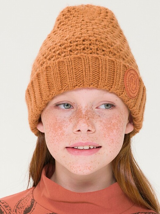 Вязанная шапка из акрила с отворотом и подкладом из флиса для девочки. Идеальная посадка по голове, плотно прилегает к ушам, защищает от холода и ветра. Шапку украшает необычный фактурный рисунок вязки, который имитирует фактуру лесных шишек. Цвет шапки - актуальный цвет вареной сгущенки. Сбоку резиновая нашивка в тон. Перевод "культивируй доброту".