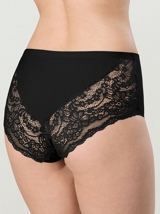 Женские трусы-шорты с высокой посадкой. Изготовлены по бесшовной технологии с минимум швов. Кромки по ноге и по талии подогнуты и приклеены, хлопковая приклеенная ластовица.  Нежное цветочное кружево придает модели утонченный вид. Продуманный крой трусов создает изящный силуэт. Модель оценят те, кто ищет незаметное и невесомое белье на каждый день или особого случая.