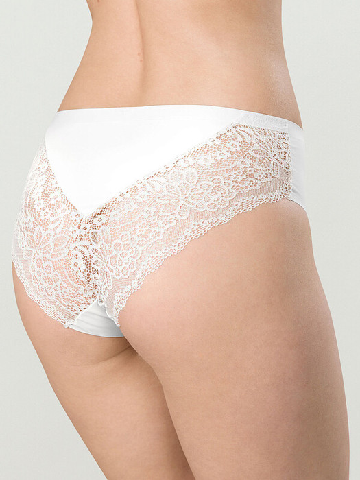 Женские трусы-слипы с высокой посадкой. Изготовлены по бесшовной технологии с минимум швов. Кромки по ноге и по талии подогнуты и приклеены, хлопковая приклеенная ластовица.  Нежное цветочное кружево придает модели утонченный вид. Продуманный крой трусов создает изящный силуэт. Модель оценят те, кто ищет незаметное и невесомое белье на каждый день или особого случая.