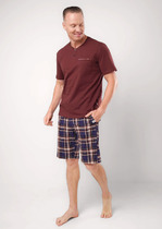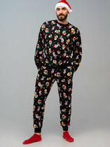 Мужская пижама выполнена из хлопкового полотна, состоит из брюк и футболки. Брюки с поясом на резинке, по бокам расположены карманы. Футболка однотонная, с коротким рукавом и круглым вырезом горловины, оформленным бейкой. Спереди нанесён принт.