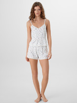 Пижама женская (топ+шорты). Топ данной модели выполнен из трикотажного полотна  кулирка с лайкрой. Шоты из трикотажного полотна кулирка. На шортах присутствует пояс на резинке, и по бокам отделка в цвет топа. Отлично подходит для сна и отдыха.