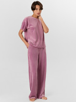 Комплект женский топ с брюками. Сшит из кулирки. Майка приталенного сулуэта на бретелях, с отрезной кокеткой. На полочке майки печать. Брюки на резинке, длиной до щиколотки.