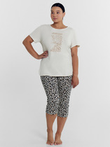 Пижама женская из трикотажного полотна «кашкорсе» с набивным рисунком, состоящая из футболки и шорт. Футболка - классического покроя, горловиной V-образной формы, окантованной основным материалом и украшенной декоративной строчкой «кроше». Нижние срезы рукавов и низ изделия обработаны узкой обметочной строчкой, создающей красивый волнистый край.Шорты – средней длины, свободные, с эластичной тесьмой по талии. Нижние срезы шорт обработаны узкой обметочной строчкой, создающей красивый волнистый край.