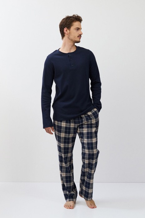 Пижама мужская со штанами LUCIE для вашего ночного комфорта. Пижама выполнена из приятной к телу ткани. Лонгслив с длинными рукавами, вырез горловины на планке с пуговицами. Штаны свободные, с эластичным поясом с завязкой и двумя боковыми карманами. Расслабьтесь с максимальным комфортом и стилем в пижаме LUCIE. Состав: верх 62% хлопок, 33% полиэстер, 5% эластан; низ 100% хлопок.