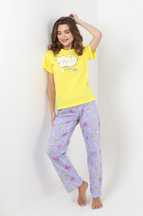 Пижама молодежная из трикотажного полотна «кулирка» в комбинации двух видов: гладкокрашеного и с набивным рисунком, состоящая из футболки и брюк. Футболка – из гладкокрашеного полотна, классического покроя, с короткими втачными рукавами, горловиной овальной формы, обработанной притачной бейкой и принтом на полочке, выполненным в технике «шелкографии».Брюки – из полотна с набивным рисунком, классического покроя, с эластичной тесьмой по талии.