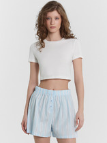 Пижама молодежная из гладкокрашеного трикотажного вискозного полотна, состоящая из топа и шорт. Топ - на узких бретелях, полочка – с лифом «бюстье», отделанным кружевом, в центре лифа – разрез, окантованный основным материалом. Основная деталь переда присборена по шву соединения с лифом. Верхний срез спинки и проймы окантованы основным материалом, бретели вытачаны из окантовки.Шорты – средней длины, с эластичной тесьмой по талии.