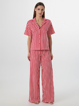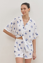 "Костюм-пижама для беременных и кормящих женщин. Футболка с V-образной горловиной, короткими рукавами, со сборкой на резинку спереди, под грудью. Шорты с уменьшенной высотой спереди для их комфортного расположения под животом, расширенные книзу.