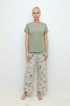 Пижама женская комбинированная с шортами. Шортики выполнены из трикотажного полотна (кулирка с лайкрой), футболка из  кулирки (100% хлопок). Шортики с поясом, атласной лентой и резинкой 5 см. Кофточка свободного покроя - оверсайз, с маленьким кармашком, отшитым по диагонали. Отличная модель для отдыха дома и сна.