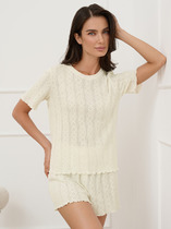 Женский домашний комплект: прямая майка с большим вырезом и свободные шорты без карманов с резинкой на поясе. Горловина и пройма майки окантованы.