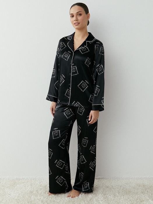 Женская пижама с контрастным принтом: свободная рубашка на пуговицах с длинным рукавом и прямые брюки с карманами и поясом на резинке. Рубашка прямого силуэта с втачными длиннными рукавами, Низ рукавов обработан манжетой с контрастным кантом.