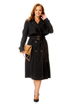 Плащ актуального прямого силуэта, выполнен из плотной экокожи с тиснением. Воротник пиджачного типа с отложными лацканами. Двубортная застёжка на петли и пуговицы. По плечевому шву обработаны погоны. Спереди отлетная кокетка и наклонные карманы с листочкой. Рукава кроя реглан, с патами по низу, с фиксацией на пуговицы. Спинка со средним швом. Для удобства движения сзади обработана шлица. Тренч на подкладке. В комплекте пояс из основной ткани с пряжкой.