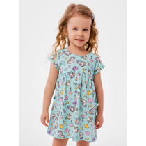 Трикотажное платье в полоску, декорированное оборкой. Трапециевидный крой, круглый вырез горловины, короткие рукава. Без подкладки.На ребенке представлен размер 110:- Ширина изделия по линии груди 31 см- Ширина по низу изделия 43 см- Длина изделия 57,7 смРазница между размерами составляет 1,5 см.