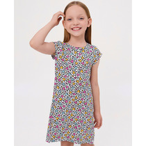 Яркое трикотажное платье без рукавов, декорированное помпонами. Свободный крой, круглый вырез горловины. Без застежки и подкладки.На ребенке представлен размер 110:- Ширина изделия по линии груди 32 см- Ширина по низу изделия 91 см- Длина изделия 55,5 смРазница между размерами составляет 1,5 см.