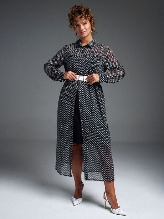 Стильный комплект, состоит из верхнего платья-рубашки и нижнего платья на бретелях. Верхнее платье прямого силуэта, с центральной застежкой по переду на петли и пуговицы, втачным воротником с отрезной стойкой, на груди с клапанами. Спинка с отрезной кокеткой, переходящей на перед. Рукав втачной, по низу с манжетой и застежкой на пуговицы. Нижнее платье-комбинация на бретелях, с нагрудными вытачками по переду. В комплекте идет съемный кожаный пояс, с металлической пряжкой.