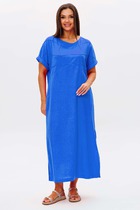 Платье из хлопковой ткани с центральной застежкой на петли и пуговицы. По переду и спинке рельефы выходящие из горловины и декоративная шнуровка по линии талии. По рельефам переда разрезы длина 39см. В боковых швах карманы. Рукав одношовный с резинкой по низу и плечам. Длина платья 112 см, длина рукава 45 см.