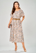 Платье на подкладке, отрезное по линии талии, степень прилегания фиксирует эластичная тесьма. Перед с нагрудными выточками. Спинка со средним швом. Рукава втачные, одношовные, короткие по окату со сборкой. В дополнении ремень.