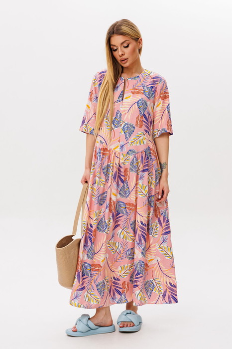 Платье свободного силуэта (стиль оверсайз), с фигурным подрезом в области талии. В боковых швах карманы. По переду застежка на потайную тесьму-молнию. Изделие без подкладки.