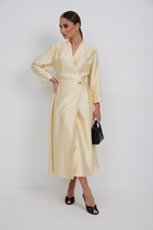 Натуральное платье из ришелье на подкладке со сквозной застёжкой на петли и пуговицы. По талии подрез со сборкой. Рукава крылышки.