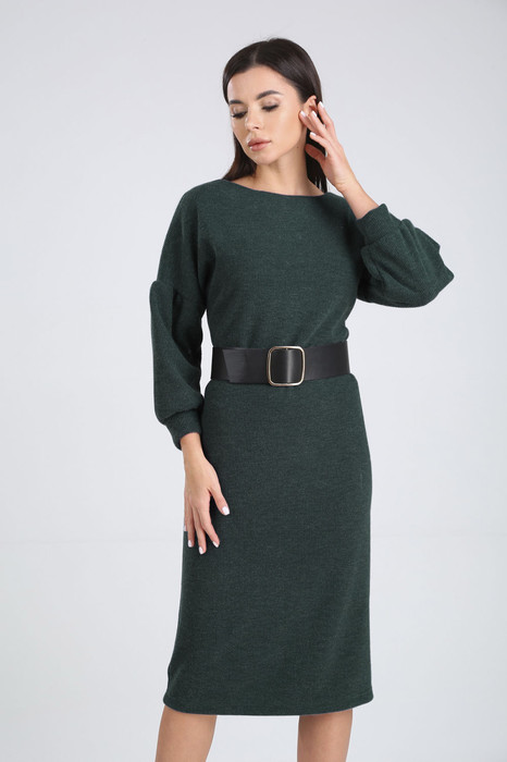 Стильное женское платье полуприлегающего силуэта, немного зауженное книзу. Платье без застежки, горловина лодочка со спущенной линией плеча. Объёмный рукав придаст этому наряду индивидуальную особенность. Низ рукава на манжете. В комплект входит ремень.