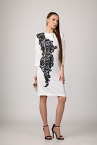 Шифоновое платье на трикотажной подкладке. По спинке застёгивается на пуговицу. Изделие отрезное по линии талии на резинке.  Рукав втачной , по низу рукава резинка.Пояс в  комплекте.