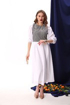 Платье из очень эффектного трикотажа с лёгким блеском. Впечатляют красотой объёмные рукава на манжете. Изделие без подкладки и без застёжки.