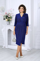 Шикарное   платье с поясом ремнем. Отличный вариант универсального изделия: подойдет как для повседневного и офисного гардероба, так и для праздничного выхода.  Отрезное по линии талии. По полочке объем груди создается за счет направленных складок из подреза. Объем юбки создается за счет центральной встречной и 2-х односторонних складок. По бокам в юбке- карманы. Рукав втачной,  3/4 длинны с отворотом.  Вырез горловины лодочка с отложным воротником. В комплекте съемный пояс. Длина спинки до подреза -45 см., длина юбки -77см. Длина рукава-44 см.