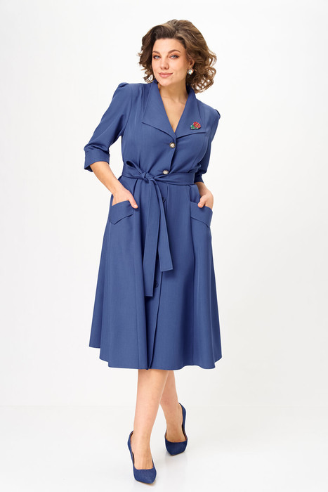 Бренд белорусской женской одежды больших размеров Anastasia представляет красивое, дизайнерское, платьев романтичном стиле для женщин плюс сайз.   Платье полуприлегающего силуэта с рельефами, выходящими из плечевого шва, и переходящими в юбку-гаде. Застежка на петли и пуговицы. Воротник стояче-отложной опаш. По полочке идут карманы с клапанами.  Рукав 3/4 длины с отложной манжетой и складками по плечу. В качестве декора идет разный дизайн пуговиц и пришивная брошь. Подчеркнуть талию можно с помощью пояса, который идет в комплекте.  В этом платье вы будете центром внимания в любой компании.  Благодаря женственному силуэту  вы будете всегда ощущать себя красивой и модной. .Все модели от Anastasia – это уникальные изделия, которые выполняются исключительно малыми партиями. Добавьте красоты и изящества в свой гардероб с нашей новой коллекцией! ВНИМАНИЕ: брошь может отличаться от фото.  Длина платья: (48-52)- 115 см, (54-56)-116см, (58-62)-118см.  Длина рукава: (48-52)-42 см, (54-56)-43см, (58-62)-45см