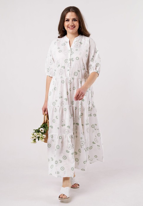 Платье женское прямого силуэта покроя реглан. Лиф переда с нагрудными вытачками, с планками и застежкой на петли и пуговицы. В боковых швах обработаны карманы. Спинка цельная. Рукав двухшовный с эластичной тесьмой по низу. Низ платья состоит из трех воланов