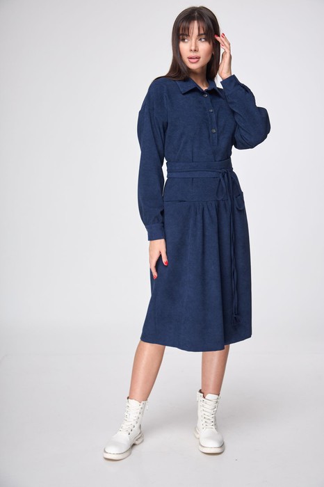 Платье женское полуприлегающего силуэта, длиной ниже колена. Рукав втачной, длинный, низ на манжете. По переду планка до линии талии на петли пуговицы. Горловина обработана классическим воротником на стойке. По линии бедра отрезной волан на сборке. Дополнительно талию можно подчеркнуть при помощи съемного пояса. Платье станет вашим лучшим другом и в нем вы будете выглядеть на все 100.