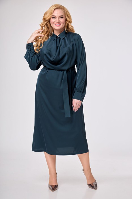 Полуприлегающий силуэт, втачной длинный рукав на манжете, неординарный воротник с застежкой на пуговицу. Безупречный образ состоит из деталей , как в нашем платье -элегантная драпировка по переду. Отличная альтернатива классическому платью.