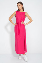Платье прямого силуэта, отрезное по талии, длинное. По центральному шву спинки потайная застежка молния. По переду разрез, который придаст образу игривости и даст вам свободу для передвижения. Рукав длинный, на резинке по низу. По всей длине рукава разрез, который декорируется лентами. Горловина округлая.