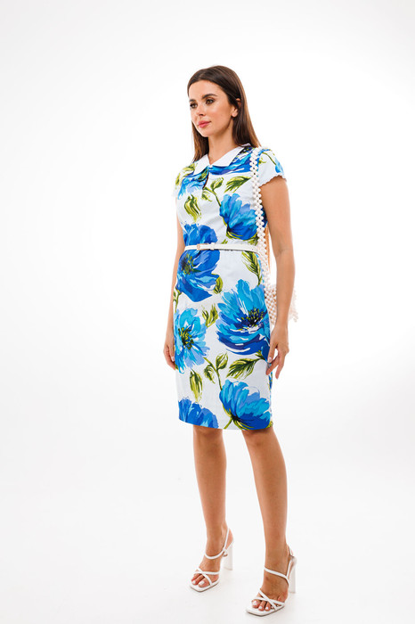 Уникальный принт в виде красивых, синих цветов добавляет нотку романтики и женственности. Ремешок на талии подчеркивает ее стройность, создавая элегантный силуэт.