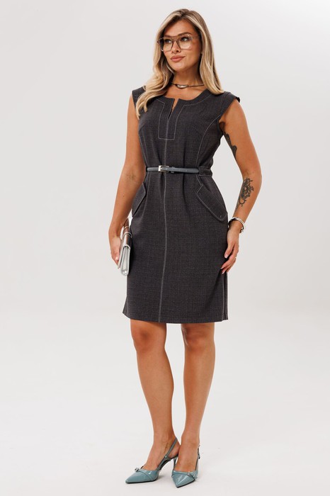 Классический сарафан «шотландский серый» прямого силуэта с подчёркивающим фигуру кроем. Модель отличается строгими линиями и сложной конструкцией. Центральный шов по переду плавно переходит в рельефы, оформляющие боковые части. В рельефных швах расположены функциональные карманы с аккуратными притачными клапанами.
