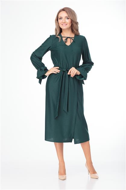 Платье полуприлегающего силуэта, отрезное по линии талии, вырез горловины V-образный, втачной рукав, нижняя часть платья впереди с запахом.