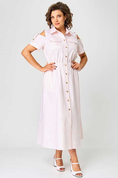 Платье полуприлегающего силуэта, расклешенное книзу. Воротник отложной, на притачной стойке. Платье отрезное по линии талии, на широкой резинке. Платье с центральной застежкой на петли и пуговицы на притачных планках. Полочка с нагрудными вытачками и накладными карманами со складкой и клапаном. В боковых швах юбки функциональные карманы. Рукав втачной короткий, с открытым плечом, понизу - притачная манжета и декоративная пата на пуговице.