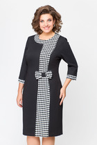 Платье женское полуприлегающего силуэта из костюмно-плательной ткани. Горловина округлой формы. Перед с нагрудными вытачками. Спинка с талиевыми вытачками, застежкой на молнию и разрезом в среднем шве. Рукав втачной прямой длинный с разрезом и декоративной застежкой на петли и пуговицы. По низу платья в боковом шве высокий разрез. Декорировано платье съемным бантом.