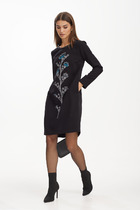 Платье женское полуприлегающего силуэта из костюмно-плательной ткани. Горловина округлой формы. Перед с нагрудными вытачками. Спинка с талиевыми вытачками, застежкой на молнию и разрезом в среднем шве. Рукав втачной прямой длинный с разрезом и декоративной застежкой на петли и пуговицы. По низу платья в боковом шве высокий разрез. Декорировано платье съемным бантом.