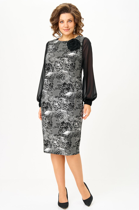 Платье полуприлегающего силуэта с округлой горловиной. Перед с нагрудными вытачками. Спинка с талиевыми вытачками, застежкой молнией и разрезом в среднем шве. Рукав втачной прямой длинный, на резинке по низу.