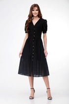 Классическое женское платье отрезное по линии талии. Лиф платья по переду с рельефными швами, на горловине небольшой декоративный разрез. Спинка лифа со средним швом, в котором находится потайная молния. Приталивание спинки лифа достигается при помощи талиевых вытачек. Юбка платья  полусолнце, посредине переда юбки декоративная вставка гофре.  Рукав прямой 3/4, одношовный. Горловина платья обработана обтачкой. Модель подойдет на рост 164-170 см. К платью прилагается съемный пояс. Длина изделия по спинке 115 см