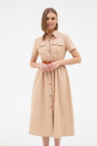 Платье приталенного силуэта, на подкладке. Вырез горловины квадратной формы. Отрезное по линии талии. Перед и спинка с рельефами. По спинке средний шов, в котором вставлена потайная молния, внизу разрез. Рукав втачной длиной 3/4, по окату присборен на резинку, в нижней части рукава сборка на венгерку.