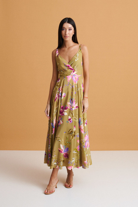 Платье полуприлегающего силуэта выполнено из струящегося полотна с цветочным принтом. Характеристики: полуприлегающий силуэт, отрезное, по отрезу стабильная вставка, регулируемые бретели, фигурный вырез горловины, застежка - потайная молния по спинке, юбка в изделии пышная, свободного кроя. Длина по спинке 128 см.